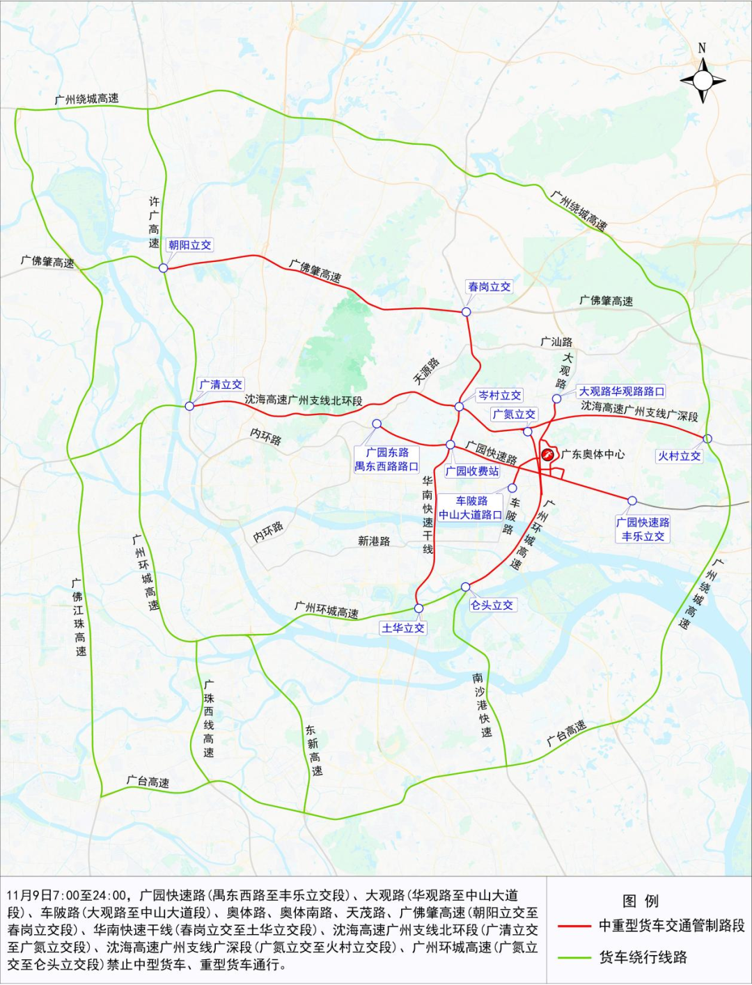 ◼︎11月9日7:00至24:00,广园快速路(禺东西路至丰乐立交段)、大观路(华观路至中山大道段)、车陂路(大观路至中山大道段)、奥体路、奥体南路、天茂路、广佛肇高速(朝阳立交至春岗立交段)、华南快速干线(春岗立交至土华立交段)、沈海高速广州支线北环段(广清立交至广氮立交段)、沈海高速广州支线广深段(广氮立交至火村立交段)、广州环城高速(广氮立交至仑头立交段)禁止中型货车、重型货车通行。